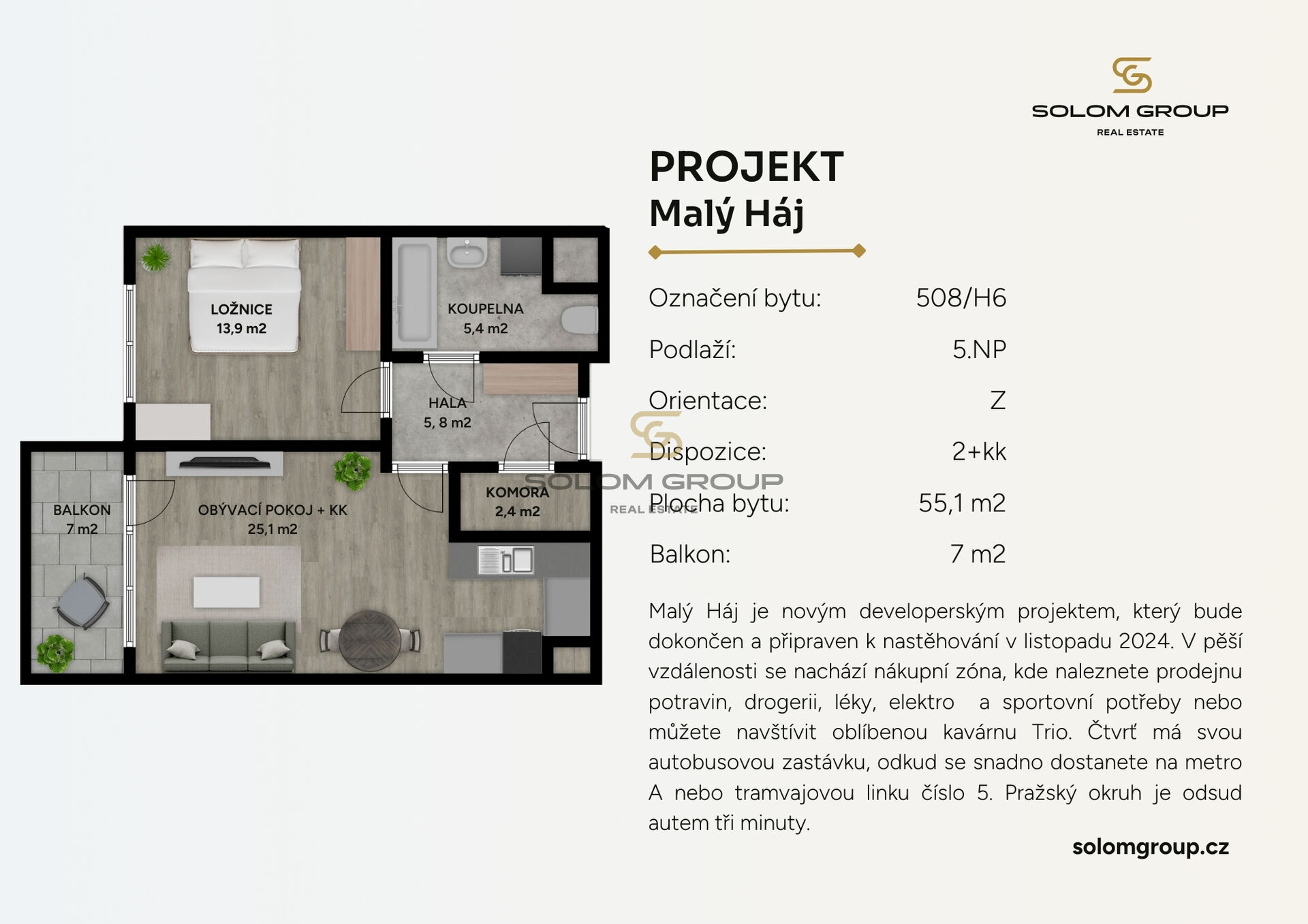 Prodej nového bytu 2+kk o velikosti 55,1 m² + balkon 7 m² + komora, který se nachází v 5. patře cihlové novostavby v rezidenci Malý Háj – Praha 10 Štěrboholy, budova H6.
