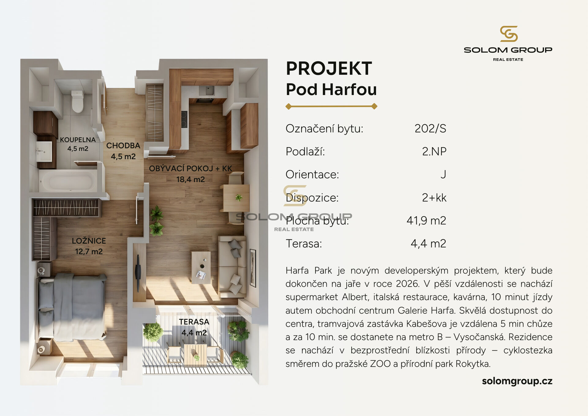 Prodej nového bytu 2+kk o velikosti 41,9 m² + terasa 4,4 m², který se nachází ve 2. NP cihlové novostavby v rezidenci Harfa Park (dům S).