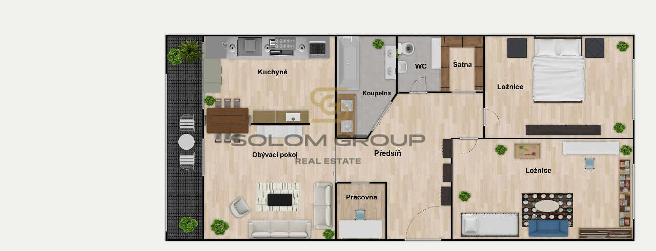 Dvě neprůchozí ložnice, koupelna s vanou, samostatná toaleta, prostorná šatna a pracovna.