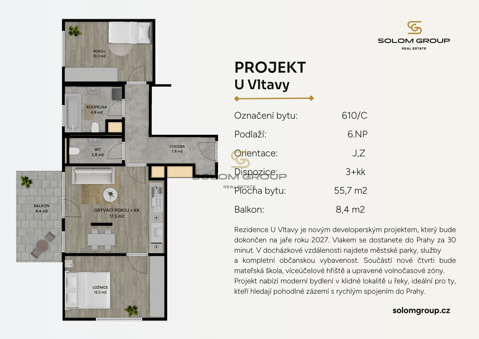 Prodej nového bytu 3+kk o velikosti 55,7 m² s balkonem 8,4 m² , který se nachází v 6. NP cihlové novostavby v Rezidenci U Vltavy, Kralupy nad Vltavou (Dům C).
