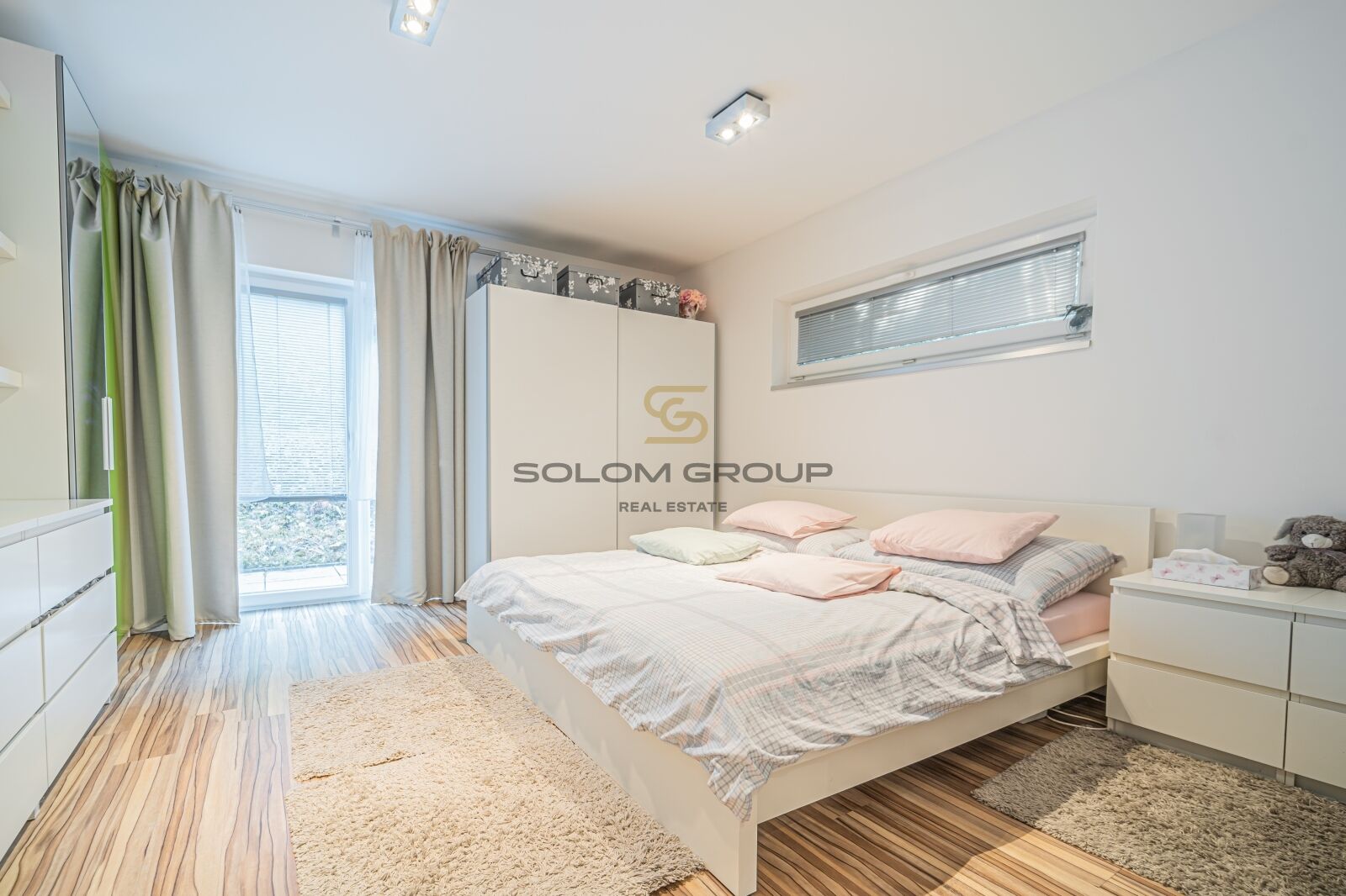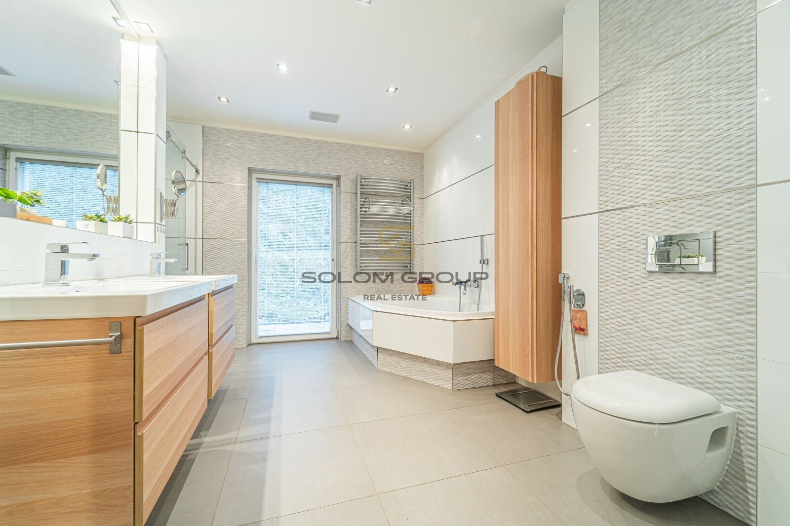 Z obývací části je přímý vstup na zahradu. Dále jsou zde dva dětské pokoje a hlavní ložnice s šatním prostorem, ze všech místností je umožněn přístup na terasu a zahradu. Koupelna je vybavena vanou, walk-in sprchovým koutem, dvěma umyvadly a toaletou. Další samostatná toaleta se nachází v chodbě.