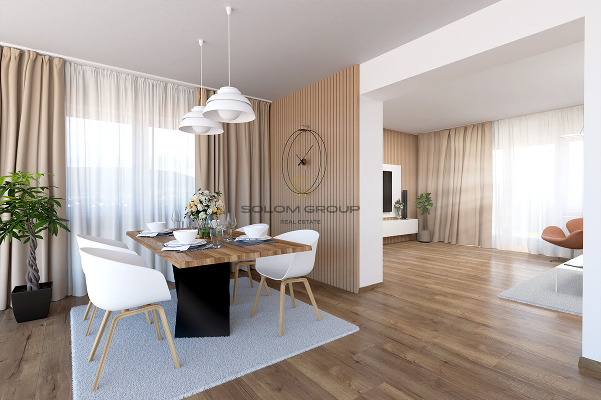 V přízemí se nachází velkorysý obývací prostor s jídelnou a moderní kuchyňskou linkou vybavenou vestavěnými spotřebiči – sklokeramická varná deska, odsavač par, lednice s mrazákem, horkovzdušná a mikrovlnná trouba, myčka nádobí.