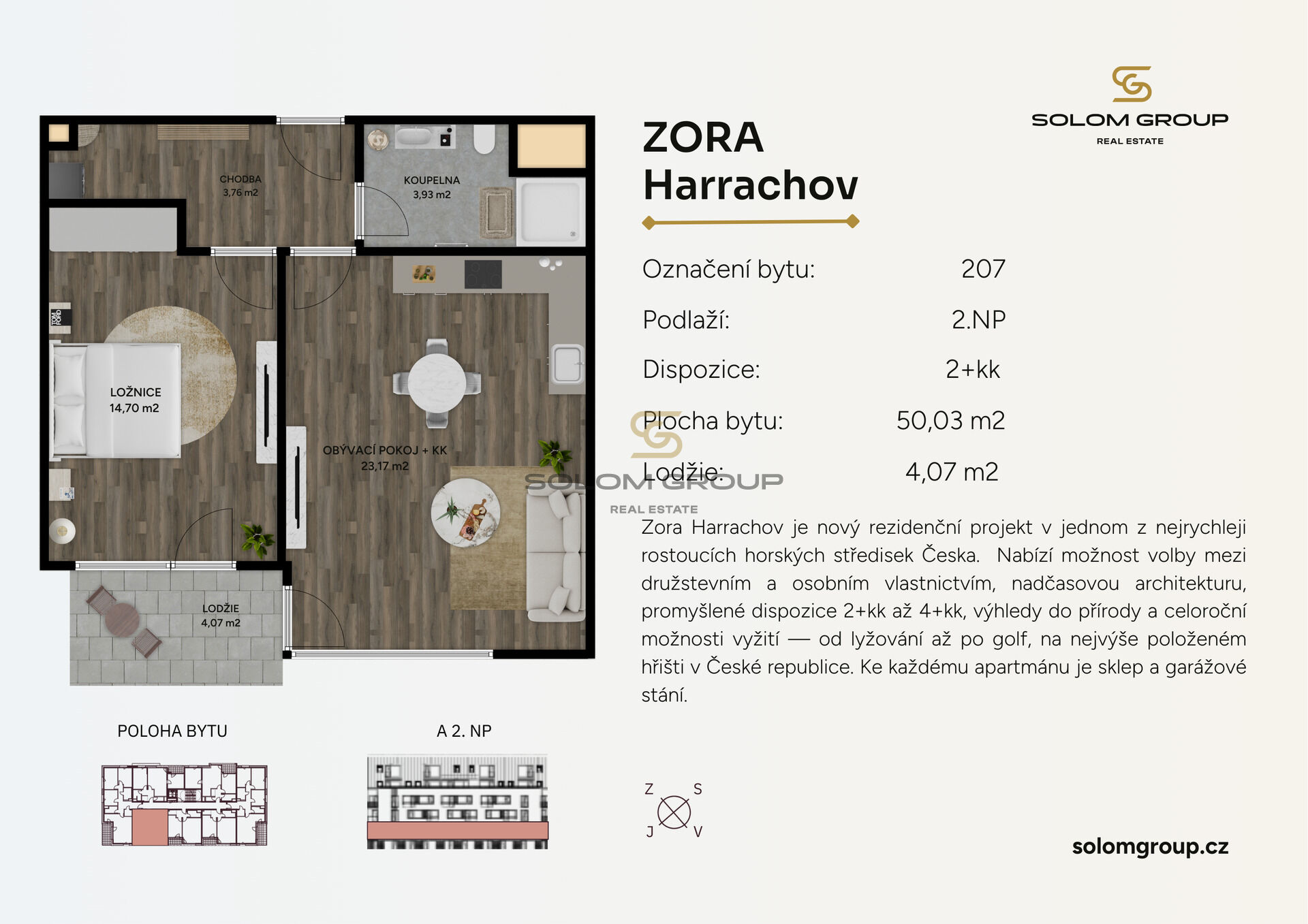 Prodej nového apartmánu 2+kk/Lodžie, 54,10 m² (byt o výměře 50,03 m² + lodžie o výměře 4,07 m²), který se nachází ve 2. NP cihlové novostavby v rezidenci ZORA Harrachov, Krkonoše (Dům A)