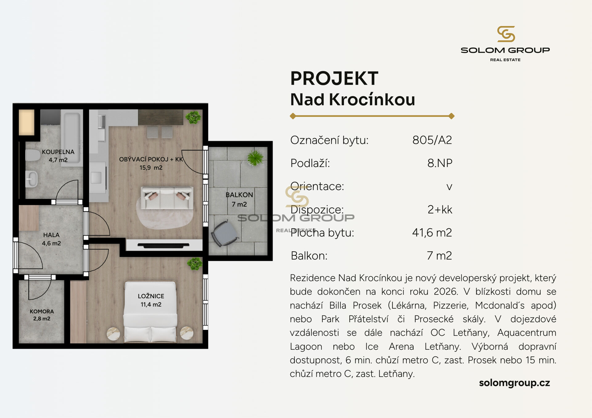 Prodej nového bytu 2+kk, 48,6 m² (byt o výměře 41,6 m² + balkon o výměře 7 m²), který se nachází v 8. NP cihlové novostavby v Rezidenci Nad Krocínkou III, Praha 9 – Prosek.