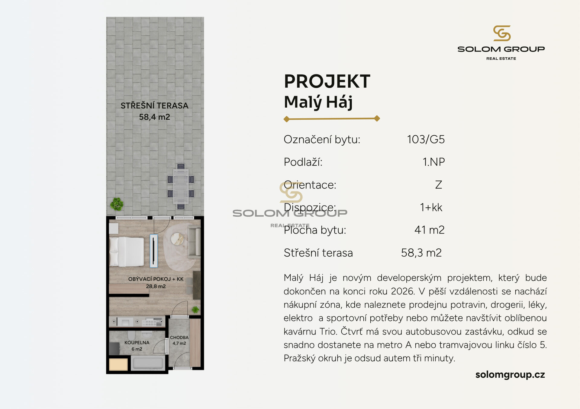 Prodej nového bytu 2+kk, 98,5 m² (byt o výměře 40,1 m² + předzahrádka o výměře 58,4 m²), který se nachází v 1. NP cihlové novostavby v rezidenci Malý Háj, Praha 10 – Dolní Měcholupy (Dům G5)