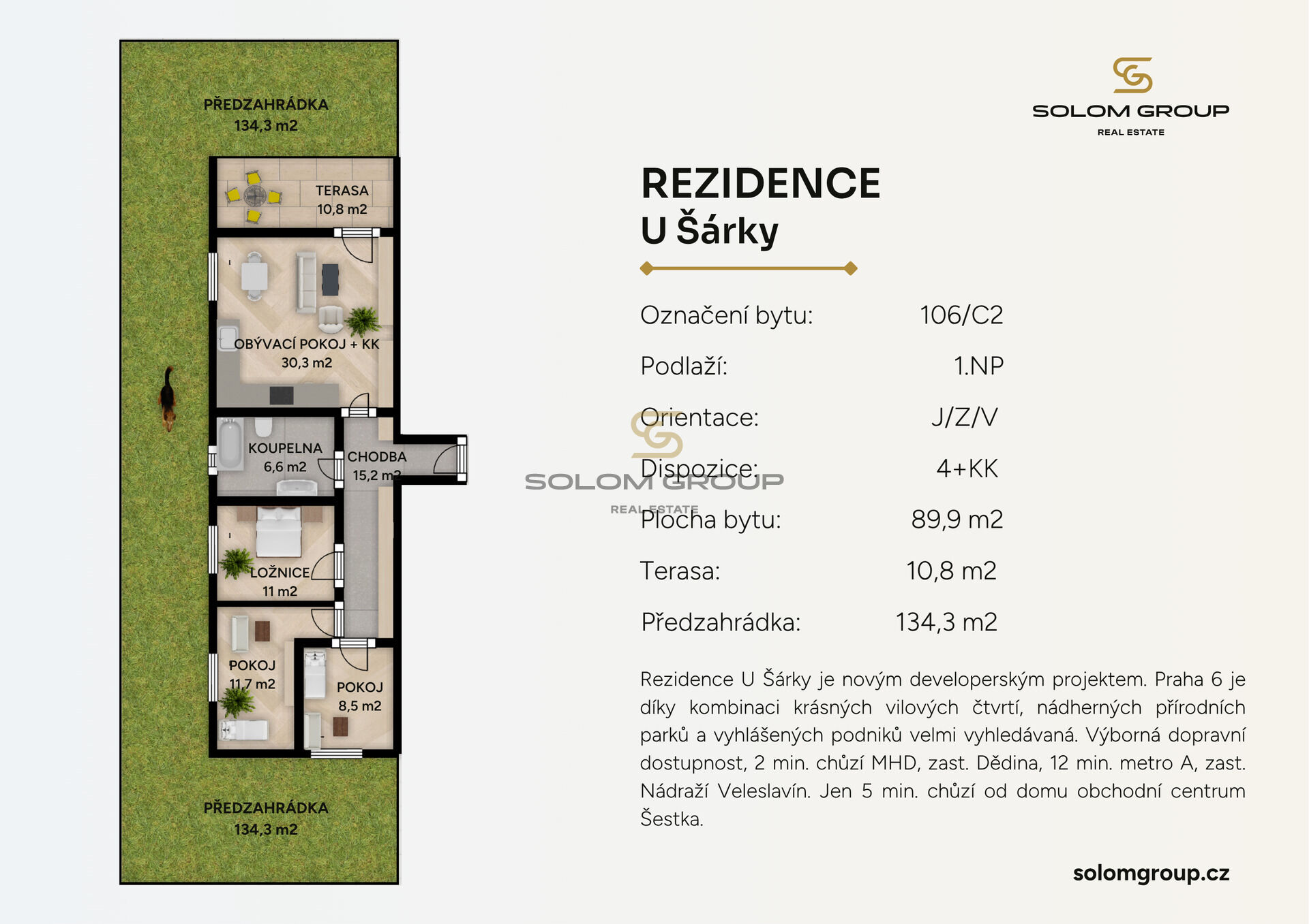 Prodej nového bytu 4+kk o velikosti 89,8 m² + předzahrádka 134,3 m², terasa 10,8 m², který se nachází ve 1. NP cihlové novostavby v rezidenci U Šárky, Praha 6 – Ruzyně (Dům C2).