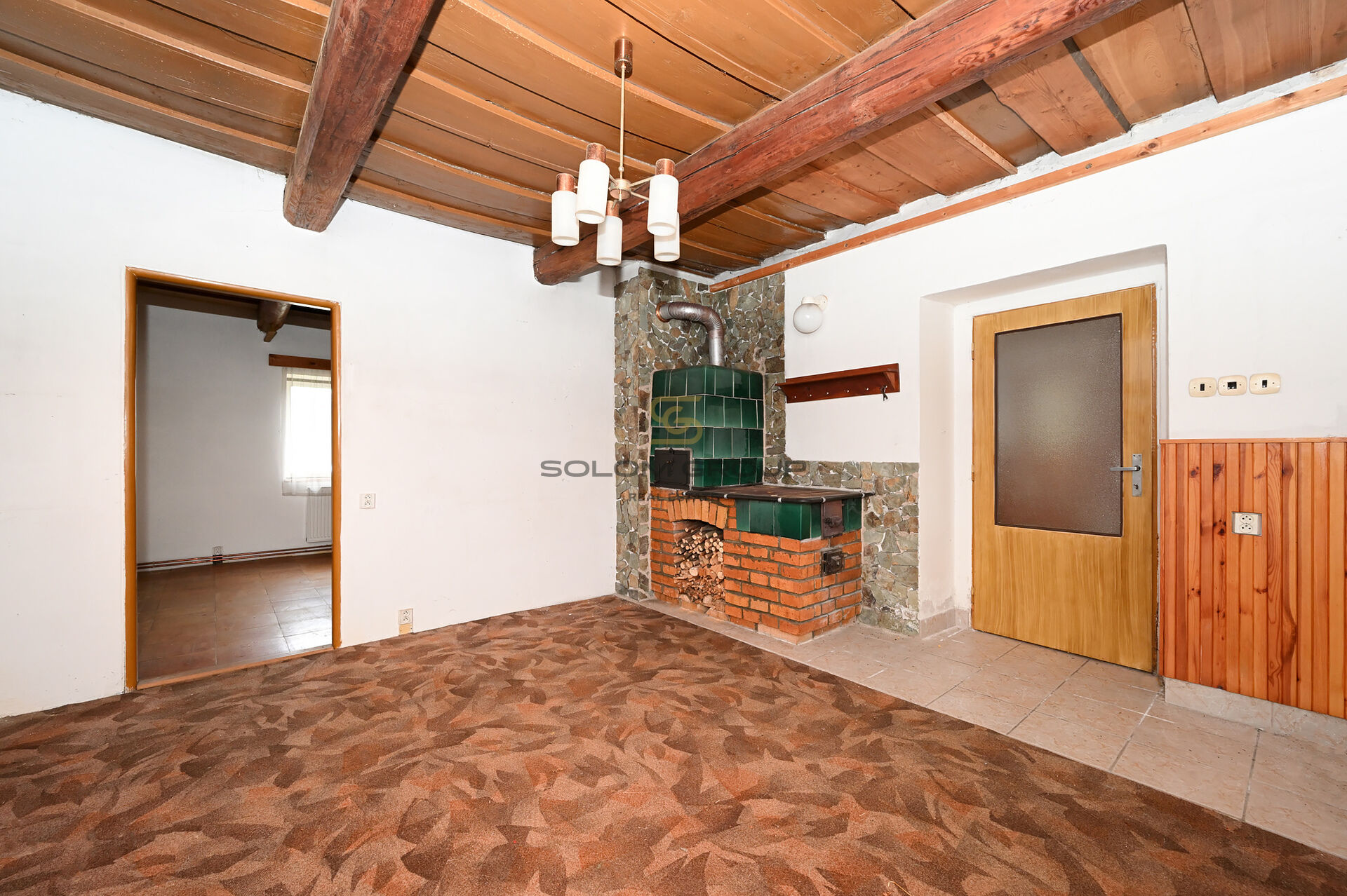 Ve všech místnostech jsou dřevěná okna a betonové podlahy. V přízemí se nachází obývací pokoj, kuchyň s kachlovými kamny a koupelna s toaletou.