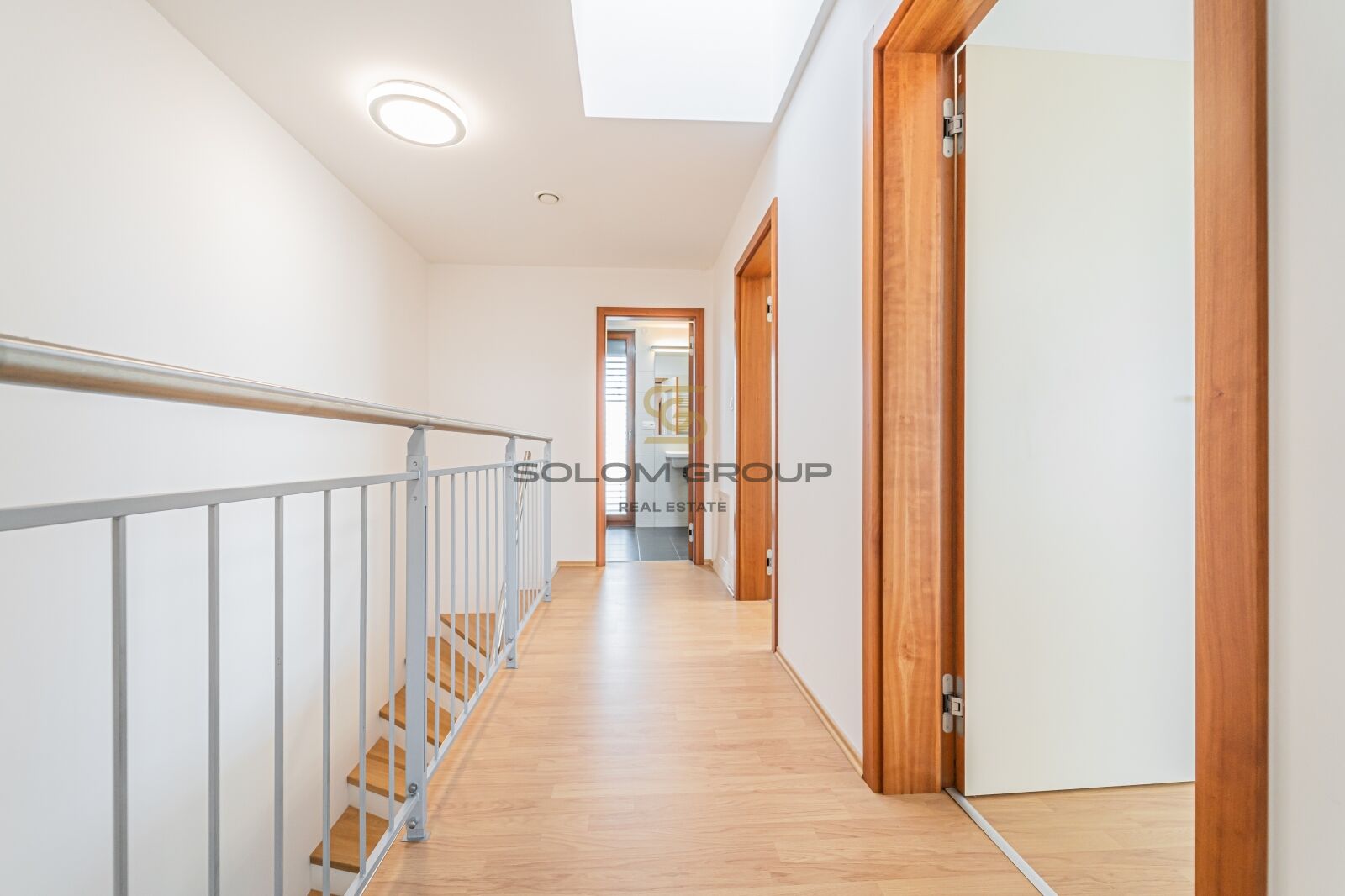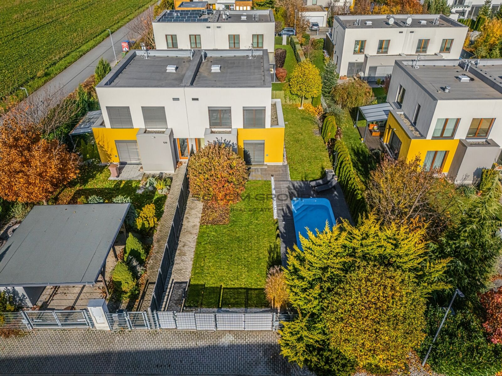 K rodinnému domu přísluší pozemek o výměře 425 m², bazén s protiproudem a slanou vodou, parkovací stání, vjezdová vrata na el. pohon, zahradní závlahový systém.