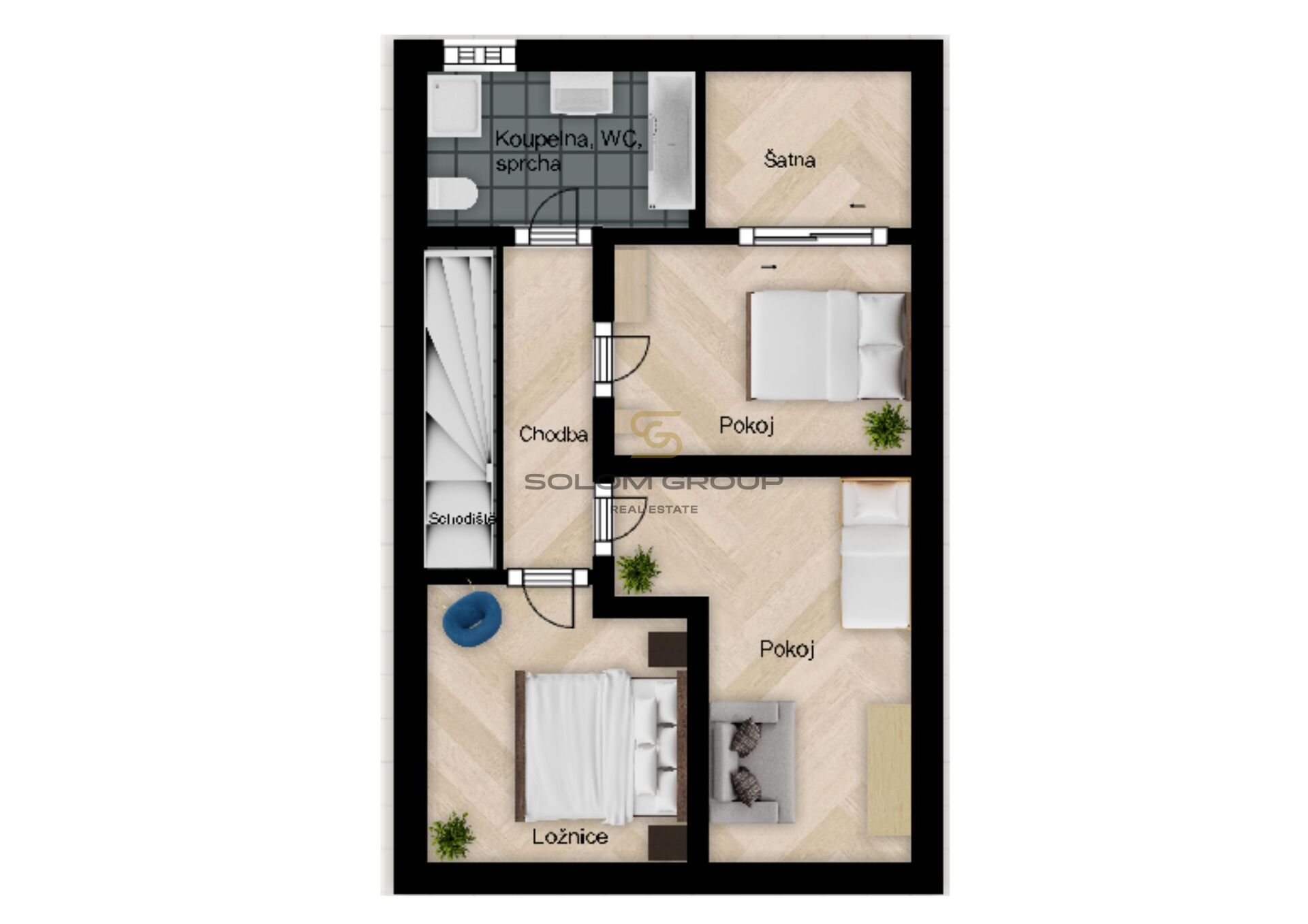 chodba, tři neprůchozí pokoje (z toho jeden včetně praktické šatny).