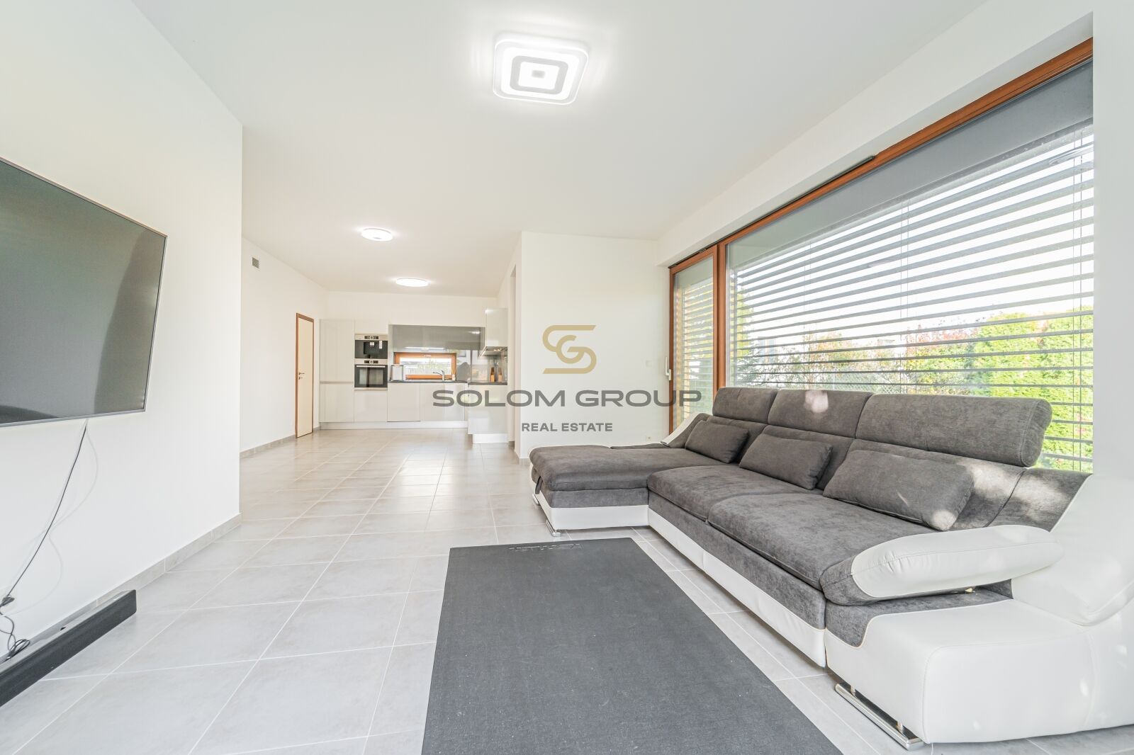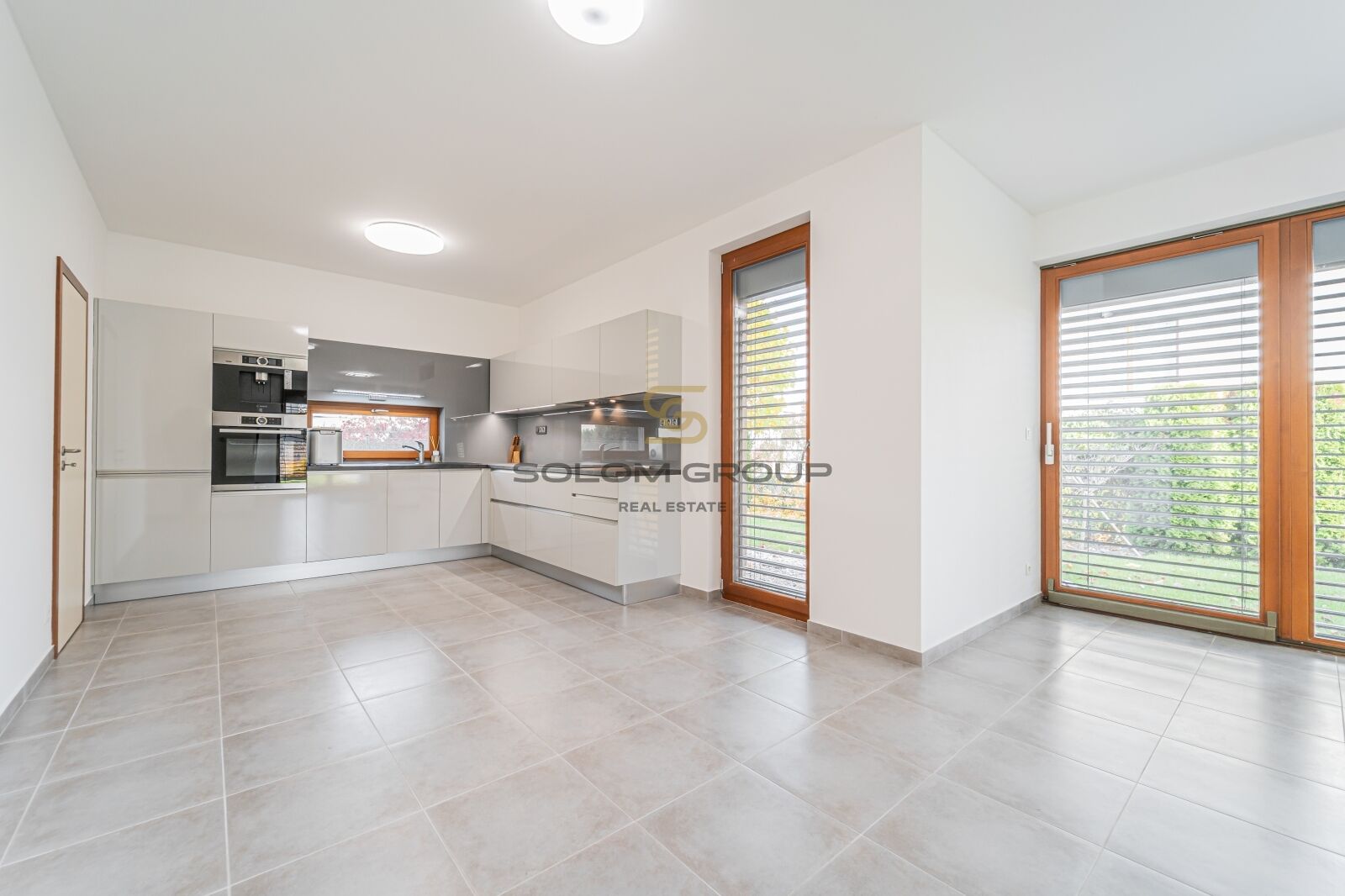 Prostorný obývací pokoj s kuchyňským koutem. Kuchyňská linka vč. vestavěných spotřebičů zn. Bosch: lednice s mrazákem, horkovzdušná trouba, el. varná deska, myčka, vestavný kávovar, digestoř. Z obývacího pokoje vstup na zahradu ze dvou stran.