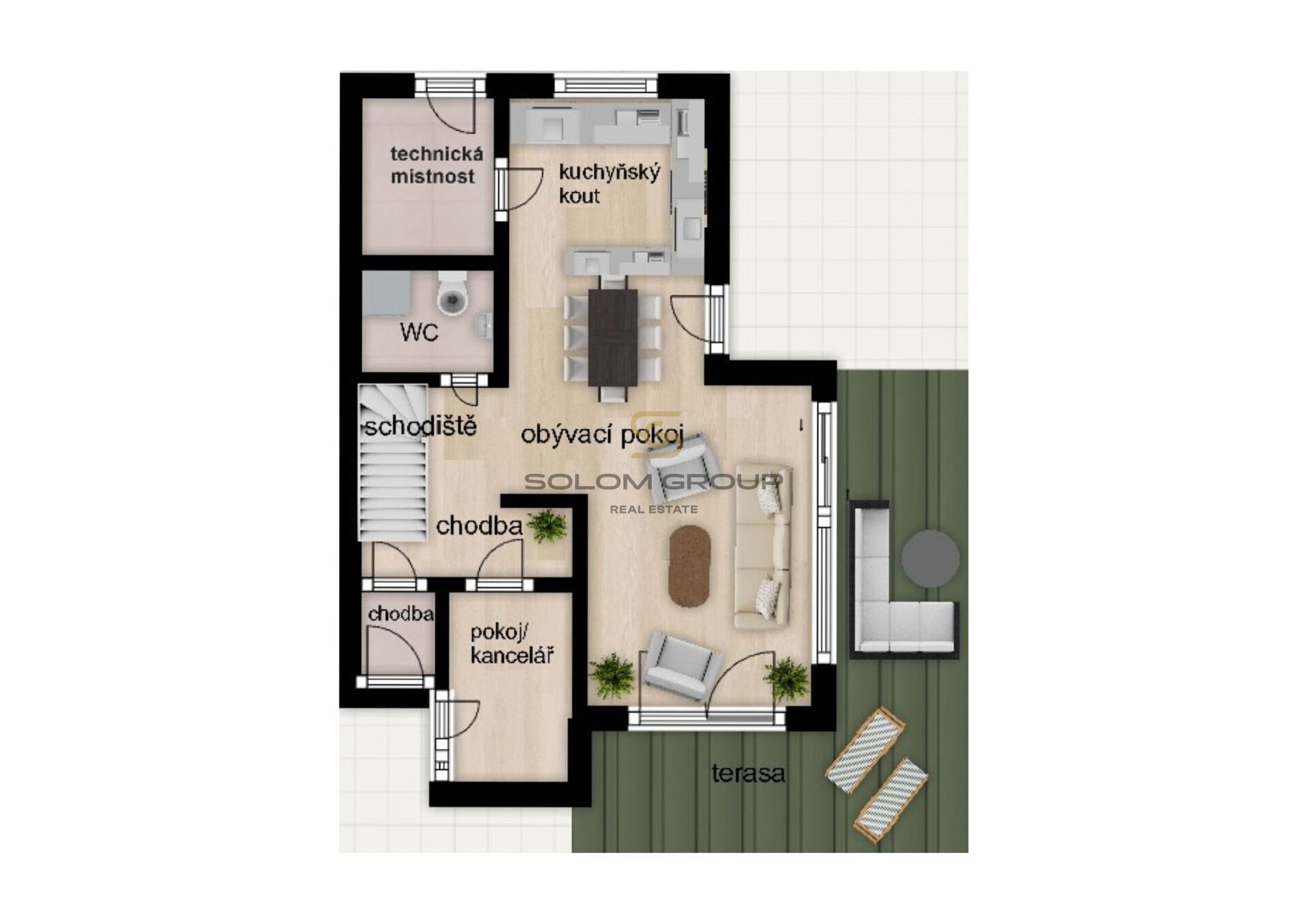 1x pokoj (pracovna/šatna) s přístupem na zahradu, samostatné WC, vstupní chodba s vestavnou skříní, dubové schodiště vedoucí do patra.