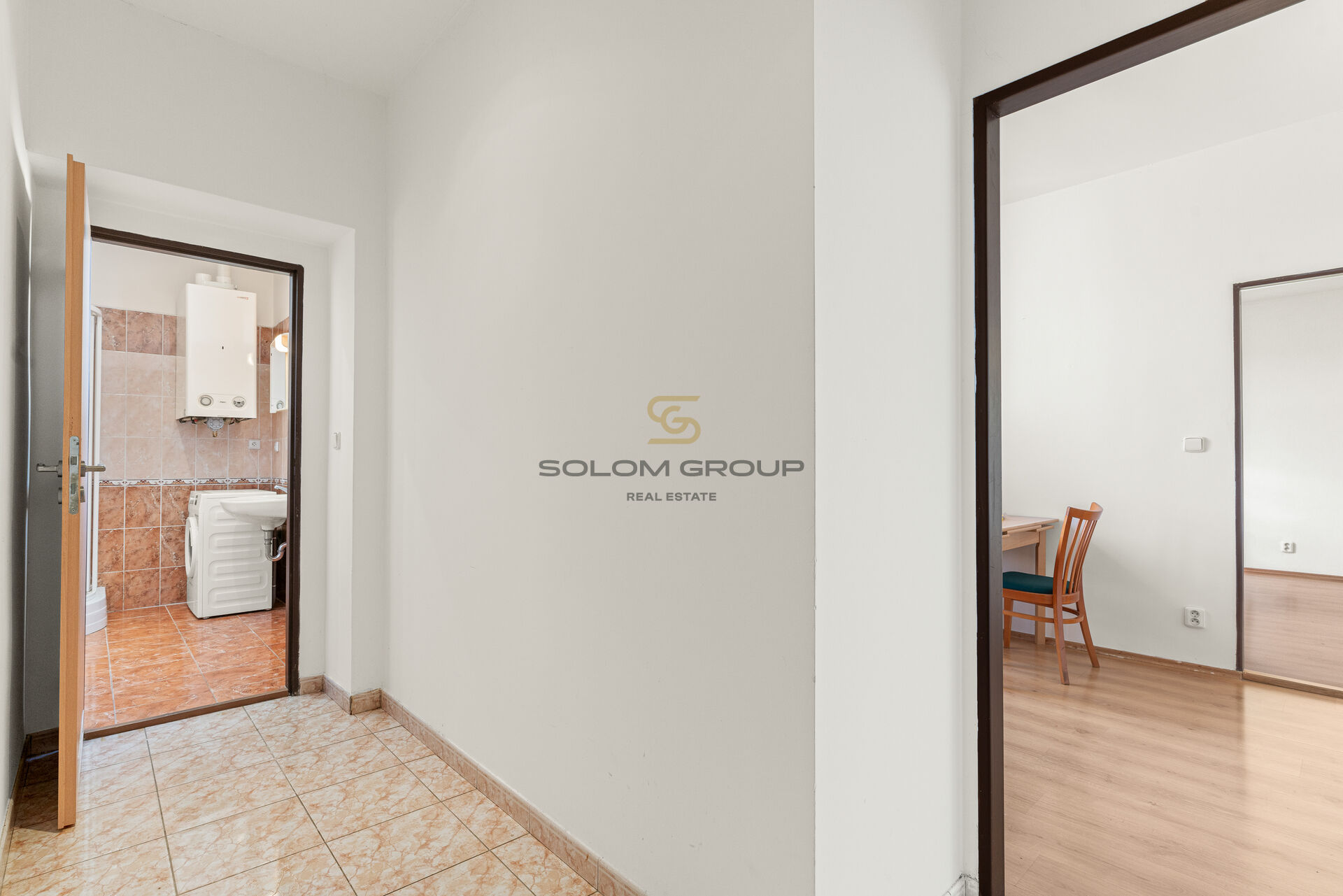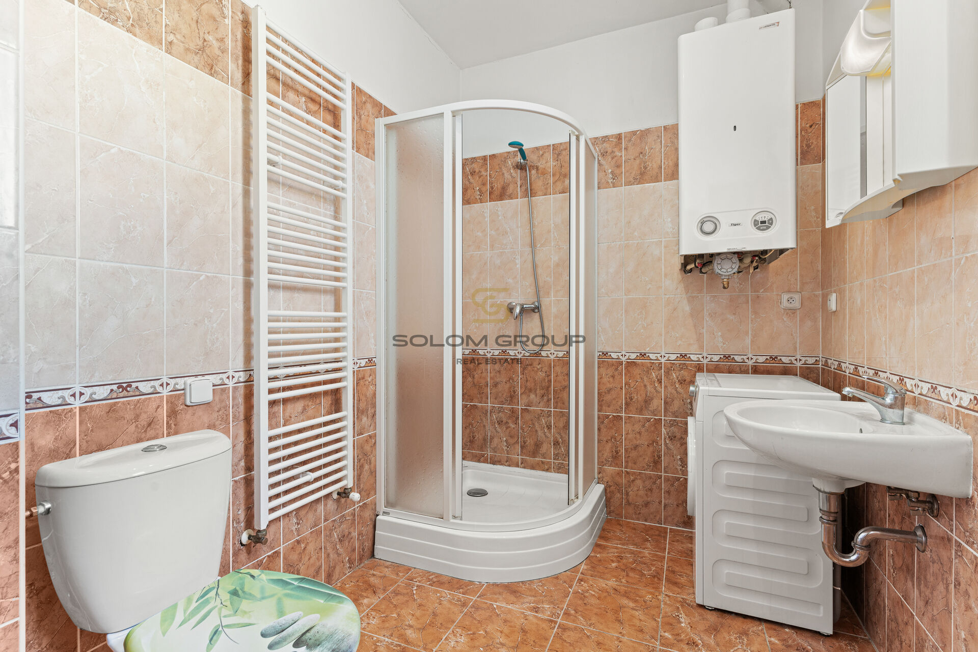 koupelna se sprchovým koutem, pračka, WC, úložné prostory, plovoucí podlahy a dlažba.