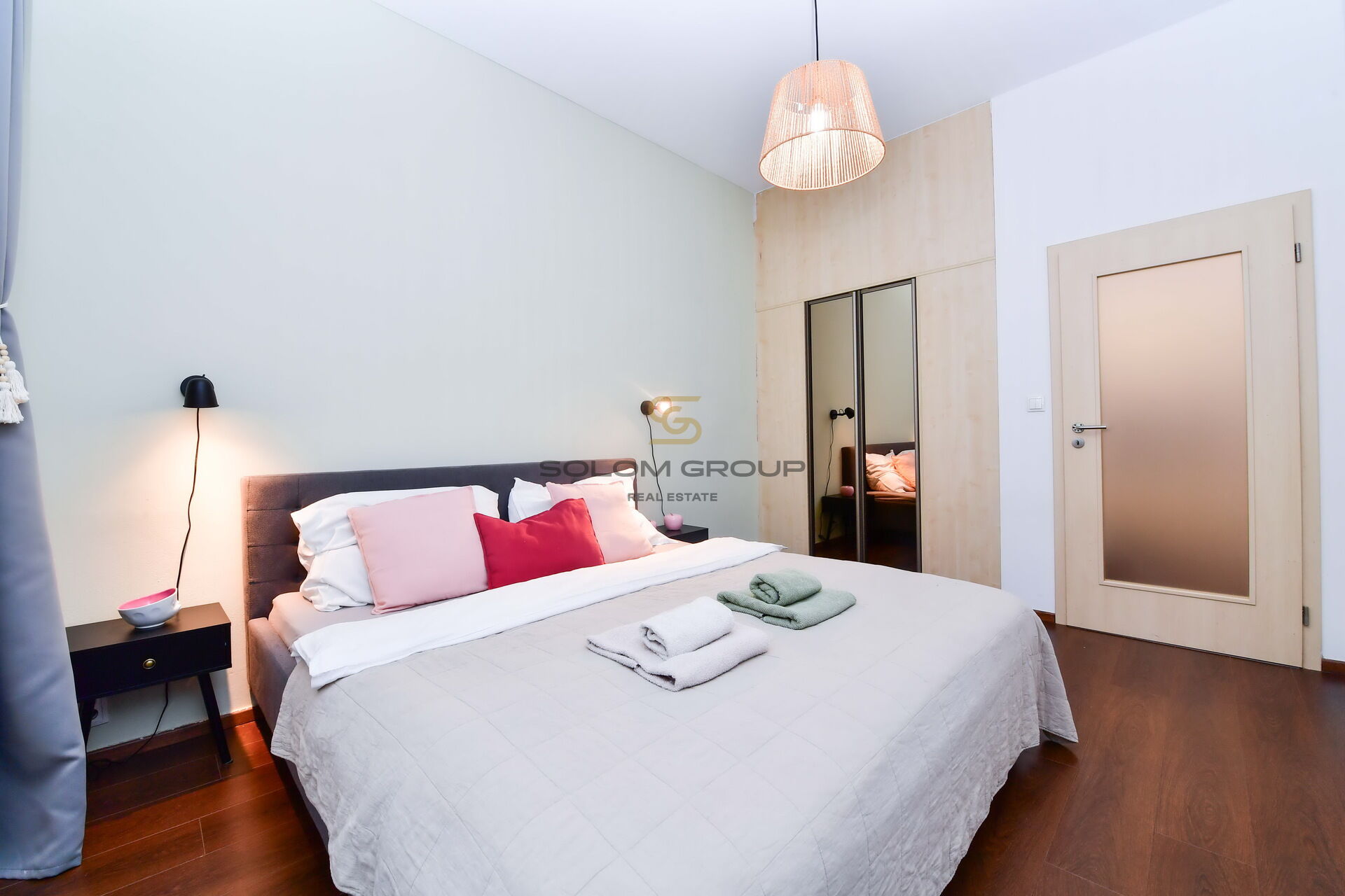 V bytě je kuchyňská linka včetně vestavěných spotřebičů. V obývací části se nachází rozkládací sedací souprava, jídelní stůl a 4 židle. Ložnice nabízí manželskou postel a vestavěnou skříň. Koupelna se sprchovým koutem a WC.