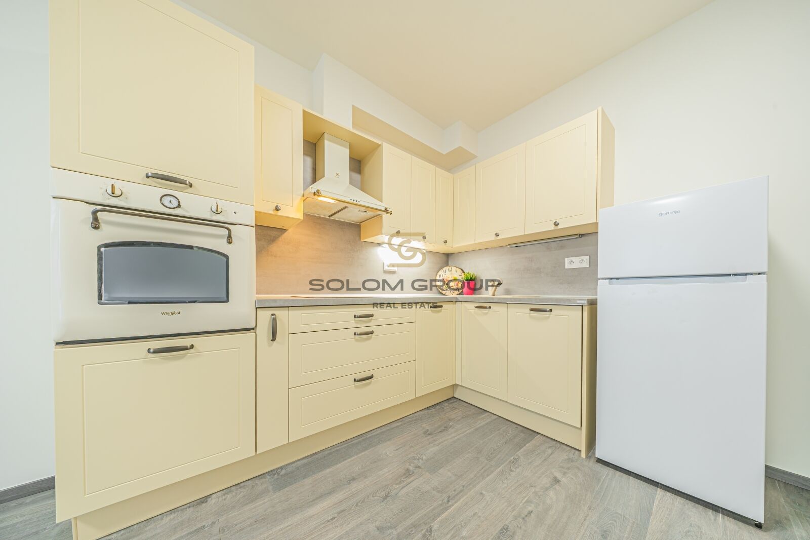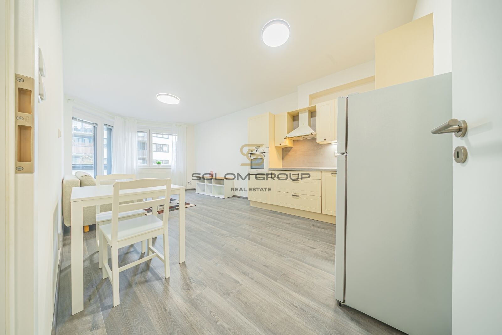 Byt je kompletně vybaven – kuchyňská linka s vestavěnými spotřebiči (lednice, myčka, odsavač par, indukční varná deska, horkovzdušná trouba ).