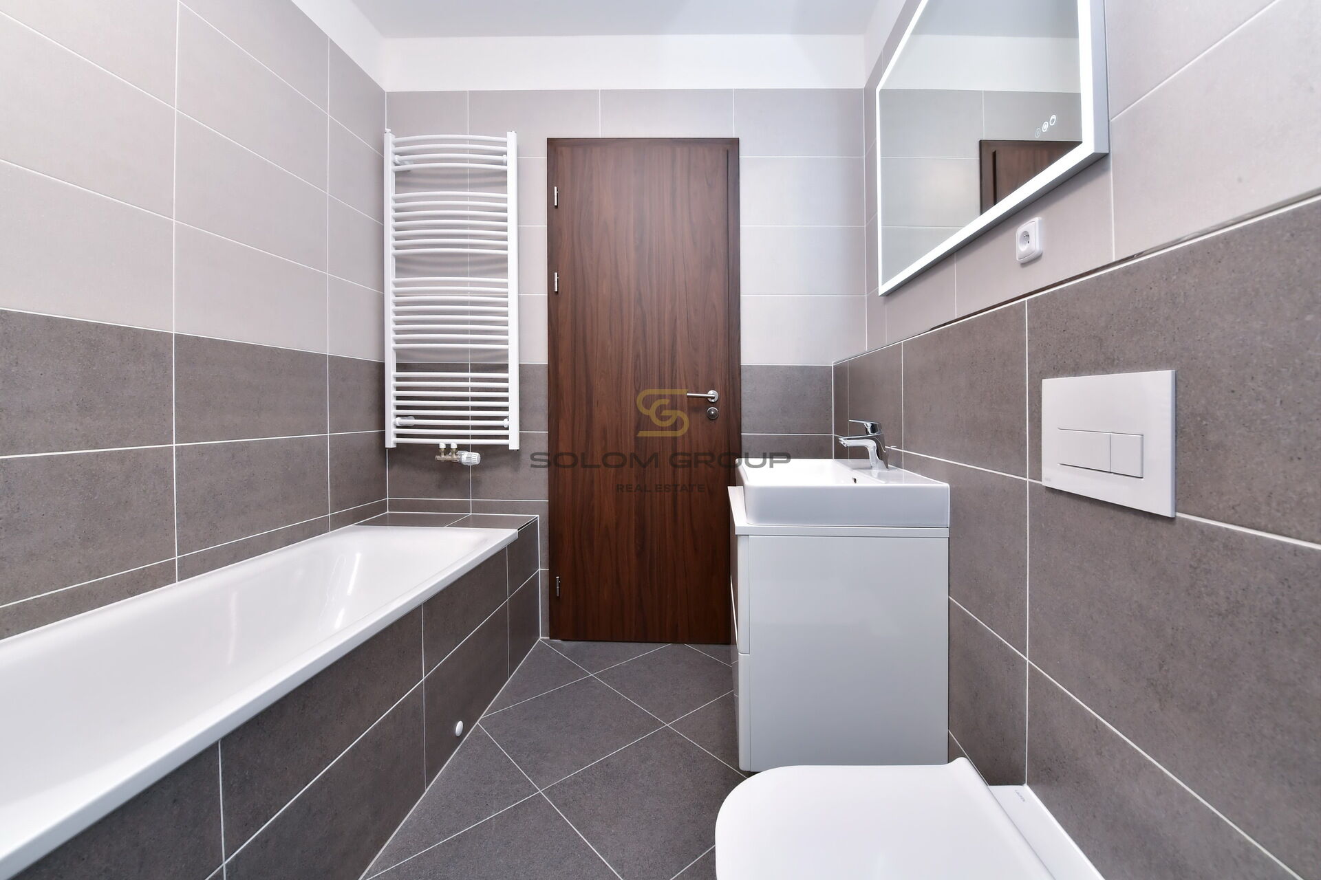 nová koupelna s vanou a WC, nové vinylové podlahy a dlažba.